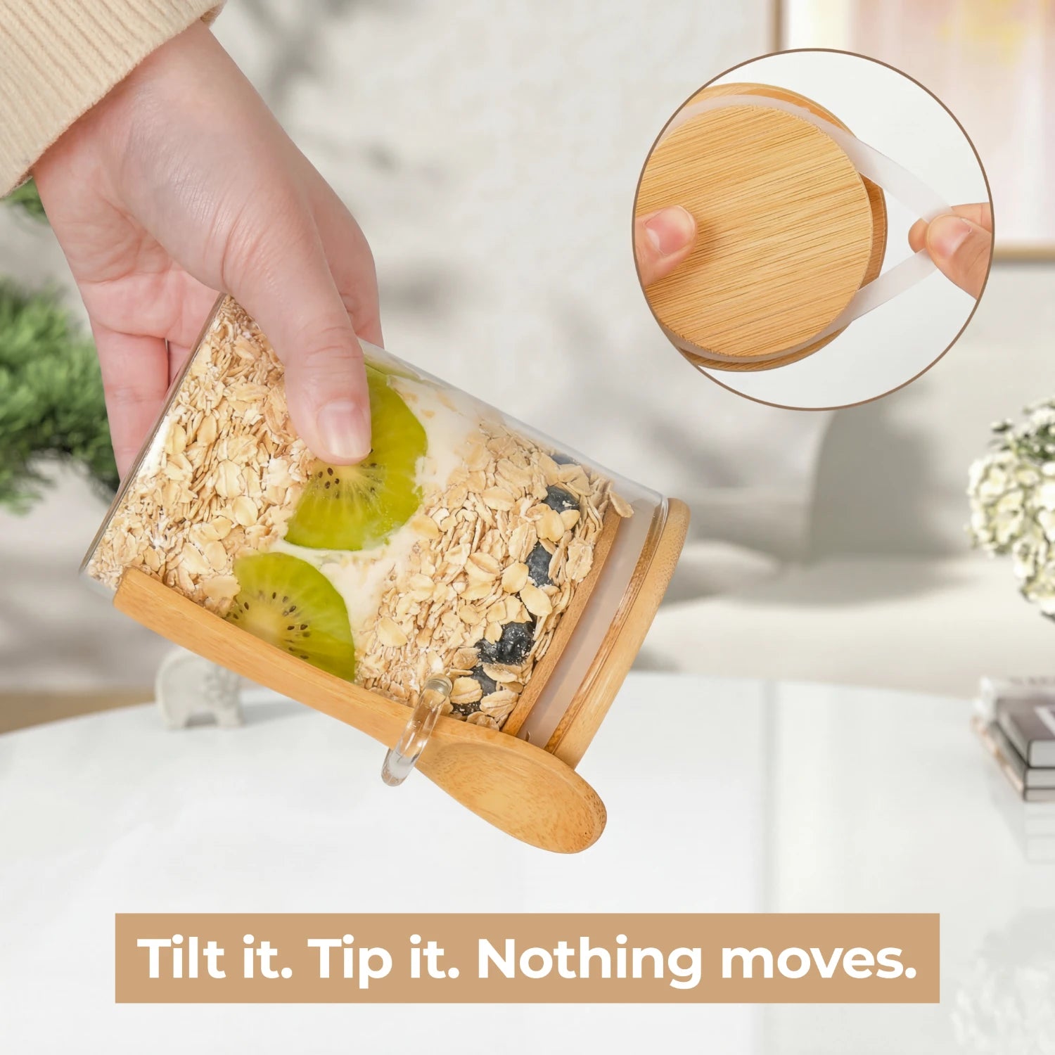 The bamboo lid fits with a silicone-gasketed seal that locks out moisture, odors, and air, so your oats stay fresh overnight and your fruit layers stay crisp until lunch. The integrated spoon slot keeps the bamboo spoon secured to the handle, so it travels with the jar everywhere it goes.